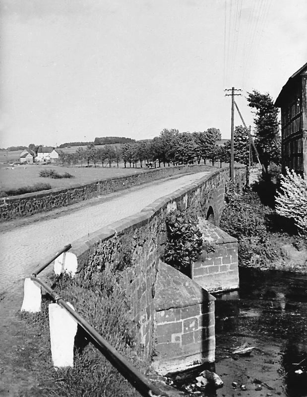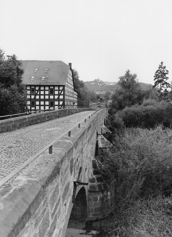 Unmittelbar bei der Brücker Mühle verlaufende Brücke über die beiden Ohm-Arme als Sammelpunkt der alten Fernstraßen "durch die langen Hessen" und der Köln-Leipziger-Handelsstraße, nachgewiesen seit 1264; Material Sandstein, sieben Steinbögen mit Vorköpfen. Erbaut in der jetzigen Gestalt zwischen 1718-22, erneuert 1762 und 1983 grundlegend saniert. Fortsetzung des Straßenverlaufs nach Osten bis zur L 3073 durch Alleebäume.