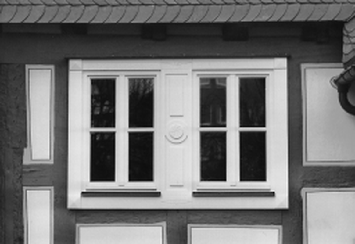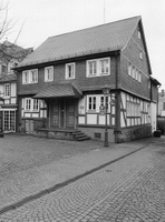 Ursprünglich in zwei Einheiten quergeteiltes Doppelwohnhaus, in jüngster Zeit zum Geschäftshaus umgebaut; links neben den noch erhaltenen beiden Haustüren ein niedriger Kellereingang zum Platz hin, Vordach und Obergeschoß handwerklich schieferverkleidet; als Erkerandeutungen vier sorgfältig detaillierte Zwillingsfenster mit Darstellung des Mainzer Rades im Mittelteil. Entstanden um die Mitte des 18. Jhs.