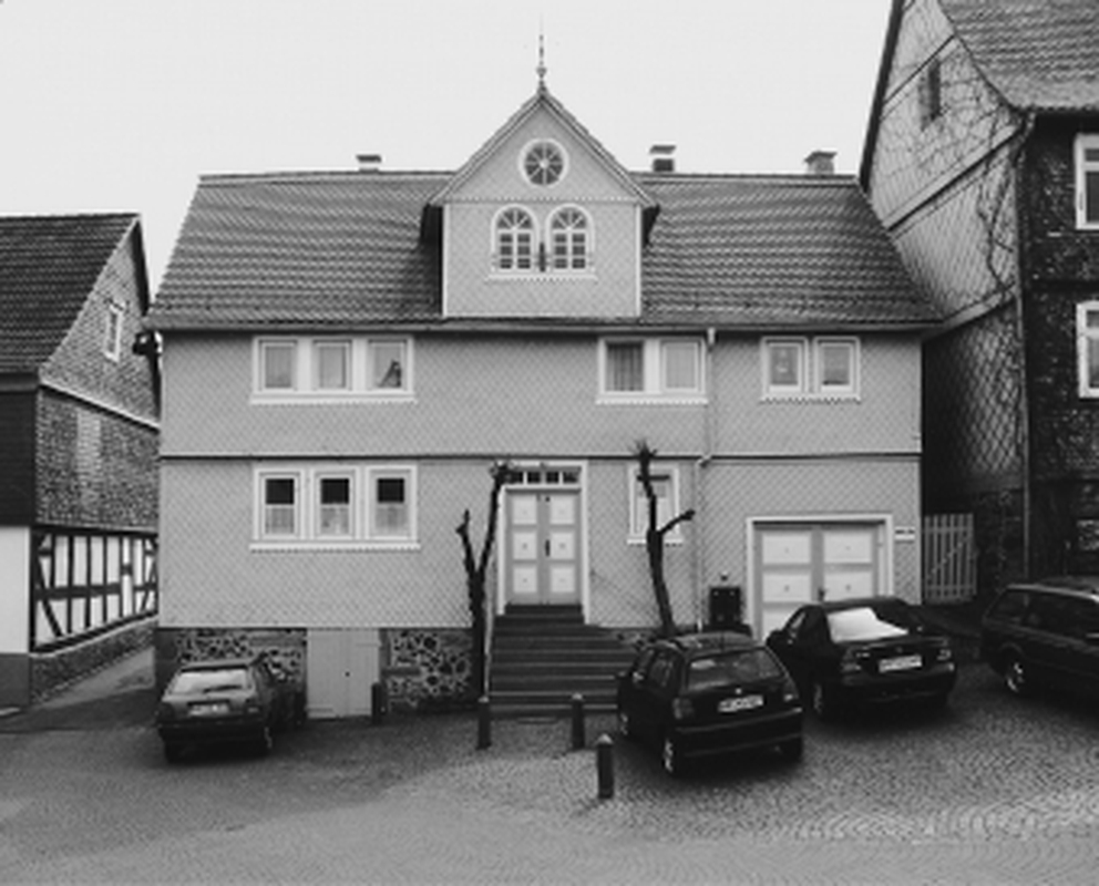 Aus einem älteren Teil und einem Bau aus der Mitte des 19. Jh. zusammengefügtes Wohnhaus, das sich heute in einer schönen traufseitigen Holzverschindelung als einheitliche biedermeierliche Fassade darstellt. Über der einläufigen Freitreppe Zwerchgiebel mit symmetrisch angeordneten Rundbogenfenstern und Mainzer Rad. Teils vom Dach bis auf den Bruchsteinsockel durchlaufende Eckständer, vermutlich stehender Dachstuhl. Entstehung um 1680. Biedermeierliche Haustür.