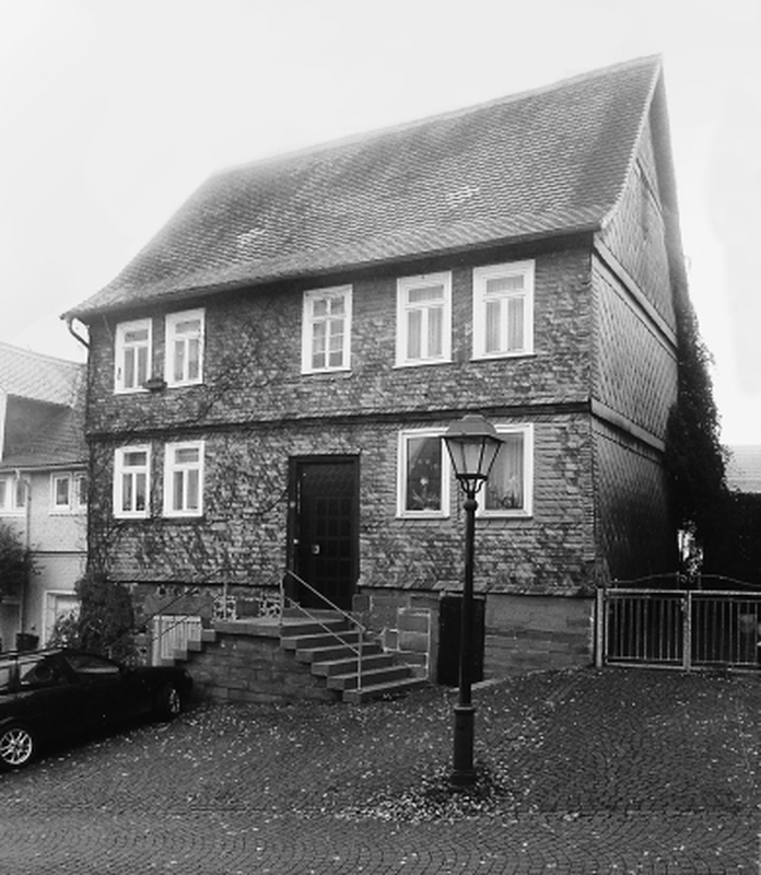 Über eine zweiläufige Freitreppe erschlossenes, traufseitig am Platz stehendes Wohnhaus eines sich in die Tiefe erstrekkenden Hofes auf hohem, früher als Stall genutztem Sockel aus Basaltbruchstein mit Sandsteineinfassungen. Die Geschosse sind allseitig gering übersetzt, das Fachwerk ist zum Platz hin verschiefert, sonst durch Asbestzementplatten verkleidet. Gegenüber dem Ursprungsbau aus dem frühen 18. Jh. ist die Firstrichtung des heutigen Baus offensichtlich gedreht; durch die Erweiterung des Baukörpers nach rechts ist das Erscheinungsbild heute traufständig.