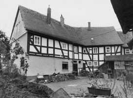 Einhaus als Teil einer die Straßenführung nachbildenden geschlossenen Bebauung. Errichtet noch in Ständerbauweise auf niedrigem Bruchsteinsockel mit Stallnutzung im Keller unter der Stube. Das Erdgeschoß hochliegend, der Eingang ebenerdig rechts mitVordach und Haustür aus dem frühen 18. Jh. An der linken Seite schließt sich die Scheune an mit einem Bergeraum über dem Scheunentor. Die Straßenseite ist handwerklich aufwendig mit Schiefer verkleidet. Entstehungszeit um 1660.