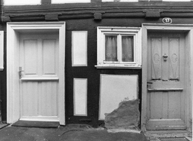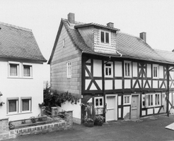 Traufständiges Doppelhaus auf niedrigem Sockel in enger Straßenflucht mit ebenerdigem Eingang, talseitig unterkellert, Obergeschoß mit profilierter Schwelle leicht übersetzt. Fachwerk mit repräsentativer Mannfigur in der Mittelachse von Haus Nr. 17. Hier auch talseitig abgeschleppter Anbau. Dachgaube aus neuerer Zeit. Handwerker- bzw. Tagelöhnerwohnhaus aus der ersten Hälfte des 18. Jhs. Die Haustüren von etwa 1830 sind noch erhalten.
