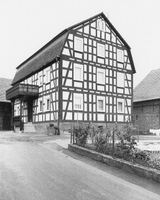 An der höchsten Stelle im Dorfkern stehendes, großvolumiges Wohnhaus mit Mansarddach auf Werksteinsockel als Teil eines umfangreichen Hofes. Typisches Fachwerk des ausgehenden 19. Jhs. Mit nach innen gekehrten Streben ohne Kopfbänder, bereits maschinengesägten, schlanken Hölzern und den spitzwinklig geformten Fenstern im obersten Giebeldreieck. 1880 laut Inschrift errichtet.