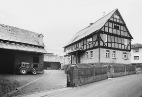 Dreiseithofreite in zentraler Ortslage, ehemaliger Erblehnhofes der Pfarrei. Giebelständiges Fachwerkwohnhaus auf Sockel aus behauenem Sandstein, das Eingangsgeschoß um die Jahrhundertwende vollständig in qualitätvollem Ziegelsichtmauerwerk erneuert und angehoben. Im Obergeschoß gerundete Kopfhölzer und gebogene Streben. Verzierte Schwellen. Zweiläufige Sandsteintreppe mit Kellereingang. Scheune mit für die Entstehungszeit typischen Mannfiguren, profilierte Schwellen, alte Fachwerkbemalung mit sich überschneidenden Beistrichen und Begleitern erhalten. Inschrift über Torbalken: "DISER BAV STEHT IN GOTTES HAND GOTT BEWAHR IN FUR FEVER VND BRAND SOLI DEO GLORIA ES IST EIN WORT DAS HAT EIN L WER ES SICHT BEGEHRT ES SCHNEL WANN NUN DAS L DARAUS EIN I IST KEIN BESSER WORT AUF EINEN IST DIESE SCHEVER IST ERBAUD WORDEN DVRCH JOHANNES SCHELTEN VND ELISABETEA BEITE E.LEVD UND IST ERHOBEN WORDEN DEN 7 APRIL DURCH M JOHANN KONRAD ZOST ANNO 1728".