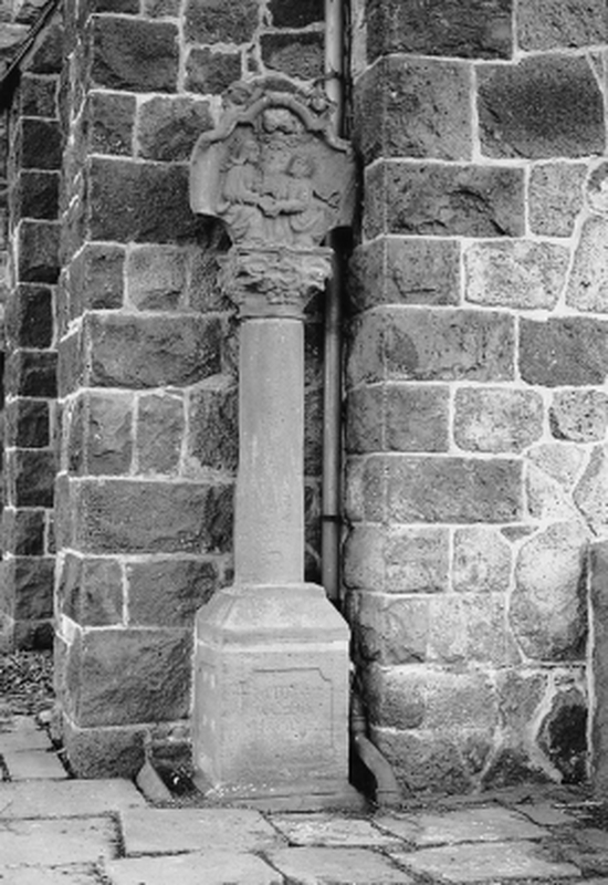 In die Ecke eines Vorsprungs im Kapellengrundriß dicht am Gebäude aufgestellter Bildstock auf quadratischem Postament mit abgeschrägtem Übergang zu einer gedrungenen Säule. Über dem korithischen Kapitell ein barock geschwungenes Bildwerk, das von zwei Putti-Köpfen abgeschlossen ist. Dargestellt ist der Gang Marias zu Elisabeth, die Heimsuchung Marias. Im Sockel befindet sich in einer Kartusche als Chronogramm die Inschrift: "MarIa aCCeDIt ELIsabeth (1753)".