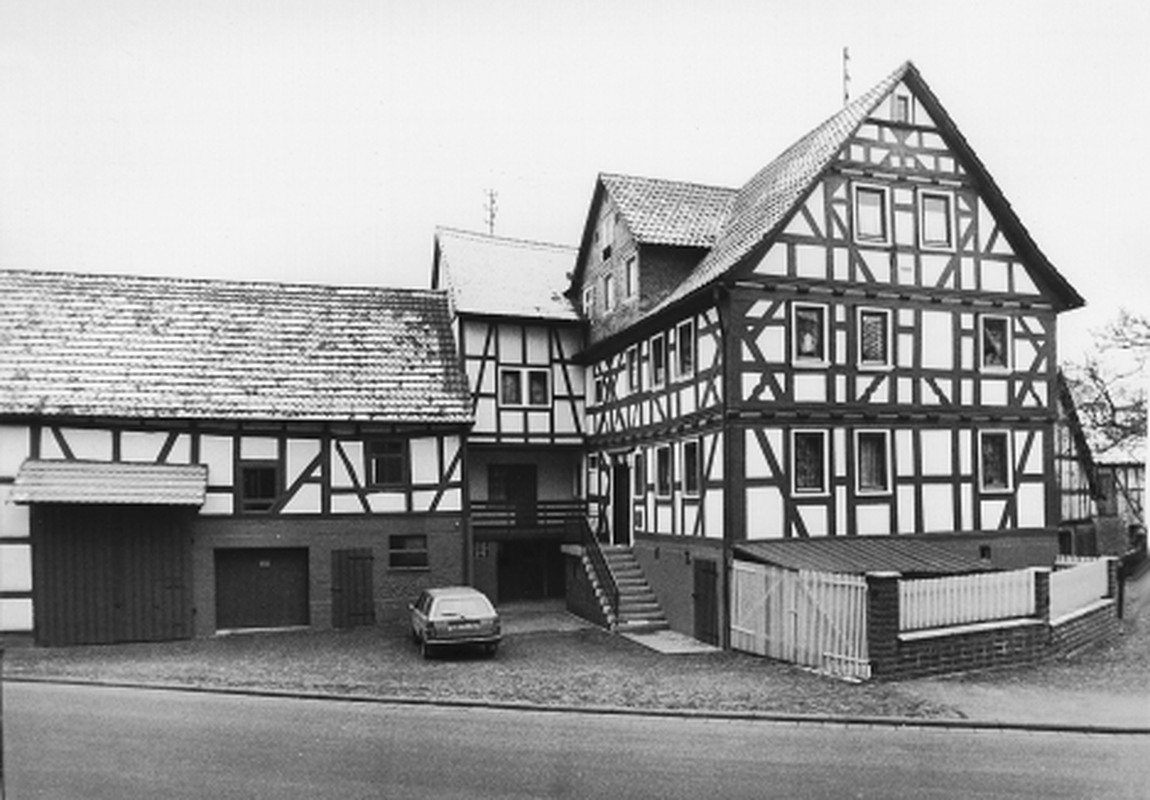 Hakenhof in zentraler Ortslage. Wohnhaus in reichem Fachwerk mit leichtem Geschoßüberstand. Eingangsgeschoß teilweise erneuert in Fachwerk. Obergeschoß mit geschweiften Fuß- und Brüstungsstreben. Rähm, Schwelle des Obergeschosses und Hölzer im Giebeldreieck sind profiliert. Für Mardorf typische Mannfiguren, an "Wilden Mann" erinnernd: Kopfholz, breitgelagerte Kopfbänder, die auf der Fußstrebe aufsitzen, an den Fußstreben Halsriegel und Sporn. Beiderseits der Haustür plastische Holzsäulen mit barocken Kapitellen. Dreieckige Platzbildung zur Straße. Einläufige Treppe überwindet hohen Werksteinsockel aus Sandstein. Gewölbekeller, da früher Gasthaus, erbaut um 1750. Die Scheune noch in Ständerbautradition errichtet. Inschrift über dem mit gerundeten Kopfhölzern verzierten Torbalken. Inschrift: "ANNO 1657 IST DISE SCHEVER ERBAVT DVRCH HINRICH SAVER VND ELISABETA MUEREN SEINE HAUSFRAVW. IN NOMINA JOH UND MARIA SOLI DEO GLORIA."