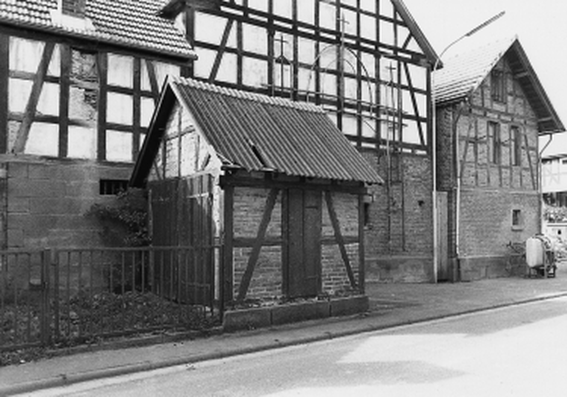 Gemeindeviehwaage; kleines einstöckiges, in Ziegelmauerwerk ausgefachtes Häuschen auf niedrigem Sandsteinsockel in unmittelbarer Nachbarschaft des unteren Backhauses gelegen. An beiden Giebelseiten jeweils mit Rampe ein zweiflügeliges Tor zum Durchführen des Viehs. Immer seltener werdendes Exemplar einer früher verbreiteten gemeindeeigenen Einrichtung ähnlich Backhaus und Leiterhaus.