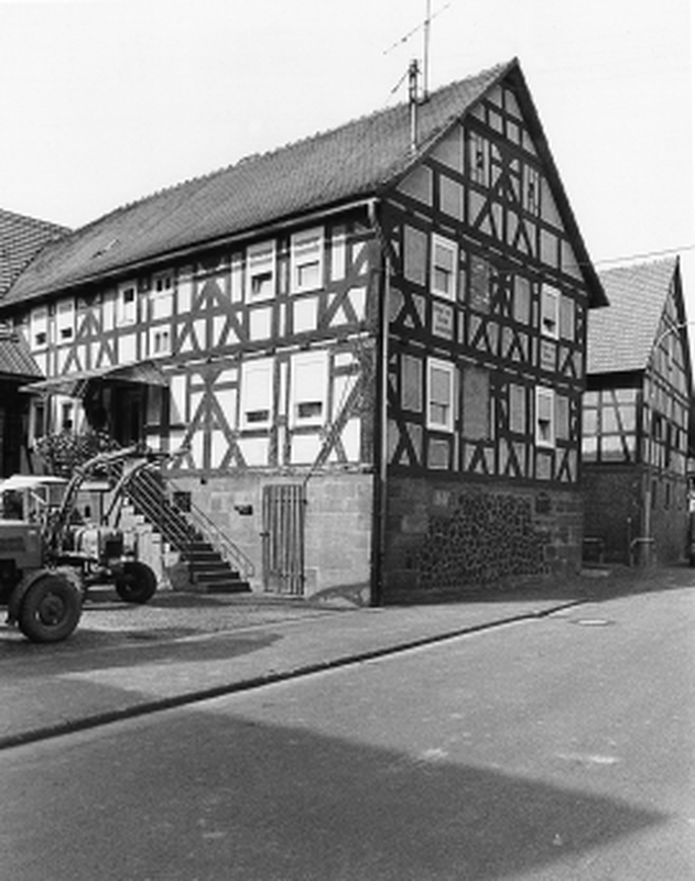 Giebelständiges Wohnhaus eines Dreiseithofes parallel zum Lauf des Lamborn gelegen, hoher Werksteinsockel mit Basaltfüllung aus dem 19. Jh., ehemals als Stall genutzt, reiches Fachwerk mit zahlreichen vollausgebildeten Mannfiguren, auch an den Bundpfosten, aus der Mitte des 18. Jhs. Geschoßwechsel mit für diese Zeit nur geringem Überstand. Vermutlich wurde der Sockel im frühen 20. Jh. erneuert.