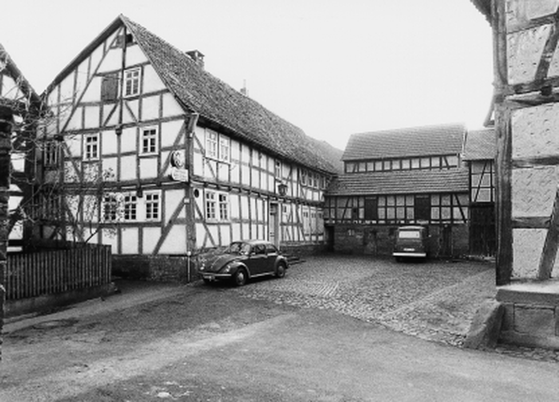 Guterhaltene Dreiseithofanlage an der Südwestecke des Kirchhofs; das in mehreren Bauphasen errichtete Haupthaus ist ein Rähmbau, wohl noch aus dem 17. Jh., mit einfachen 3/4-Streben. Der Eingang nahezu ebenerdig über kleine dreiseitige Treppe, gut erhalten die asymmetrische geteilte Haustür des 19. Jhs.; aus dieser Zeit auch die hintere Erweiterung. Über den Hof mit kleinteiliger, bogenförmiger Basaltpflasterung, datiert 1911, die Scheune mit der Inschrift: "MIT GOTTES HILFE IST DIESE SCHEUER ERBAUT DURCH ANTON (?) UND SEINE EHEFRAU ANNA GERTRUDA GEBORENE PREIS UNTER DEM GEHUBE DES ALLERHÖCHSTEN AUFGERICHTET HEUTE IM JAHR 1844 DEN VIERUNDZWANZIGSTEN IM MAI DURCH ZIMMERMEISTER JOHANNES MÜLLER ZU AMÖNEBURG"; auf der Scheune und dem Haupthaus Dachdeckung mit Handstrichbiberschwänzen. Als Verbindungsbauten ein Stallgebäude sowie ein Bäuchen aus dem 19. Jh. Wegen der früheren Nutzung als Gasthaus nahe der Kirche auch von ortsgeschichtlicher Bedeutung.