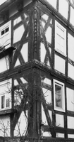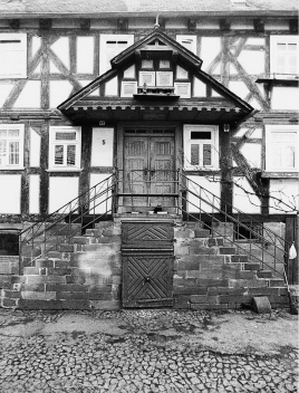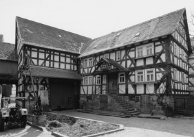 Unmittelbar südlich an die Kirchhofmauer anschließender Vierseithof; das Wohnhaus ein dreizoniger Rähmbau auf hohem Sandsteinsockel, in dem der Stall untergebracht war. Das Fachwerk mit Geschoßversatz, die Streben durch Kopfband und Kopfholz mit dem Rähm verbunden; die Eckstiele, im Erdgeschoß direkt auf dem Sockel stehend, durch Säulen zum Teil mit Neidköpfen qualitätvoll verziert. Erschließung über eine zweiläufige Sandsteintreppe mit Eisengeländer, darin eingearbeitet eine Ruhebank; unter dem Podest der Kellerzugang durch quergeteilte zweilagige Stabtür mit aufgedoppelter Kreuzverschalung. Darüber ein knaufbesetztes Vordach als Taubenhaus. Vor einigen der Fenster mit Bleisprossen haben sich auch handgefertigte Blumenbänke erhalten. Der Überlieferung nach stammt das in der ersten Hälfte des 18. Jhs. entstandene Haus aus Emsdorf und ist wohl gleichzeitig mit dem Bau der angrenzenden Scheune nach Roßdorf gekommen. Diese wurde laut Inschrift 1804 erbaut: "SOLLST DU DIE GEBOTE DES HERRN HALTEN UND DER STIMME GOTTES GEHORSAM SEYN: SO WIRD DEINE SCHEUER MIT EINER REICHEN ERNDTE ANGEFÜLLET SEYN DIESER BAU IST ERBAUET DURCH JOHANN HENRICH BRAUN UND MARIA ELISABETHA DESSEN EHELICHE HAUSFRAU IM JAHR CHRISTI 1804 DEN ZWÖLFTEN DES JULIUS". Die Scheune gegenüber dem Wohnhaus in zeittypischen Fachwerkformen wurde laut Inschrift 1844 errichtet. Direkt an die Kirchhofmauer angebaut ein kleines, sorgfältig ausgeführtes Wirtschaftsgebäude von 1868 mit Stall für Schweine und Hühner sowie einem Holzschuppen. Neben dem geschichtlichen und städtebaulichen Denkmalwert ist die Hofanlage auf Grund ihres großen Reichtums an sonst meist untergegangenen Details von besonderer künstlerischer Bedeutung.