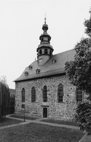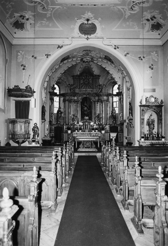 In der südlichen Ortsmitte leicht erhöht gelegen, umgeben von einem spätgotischem Wehrkirchhof mit Wehrmauer, in der sich Schlüsselscharten und ein Spitzbogenportal erhalten haben. Die Kirche ist nach Abbruch des Vorgängerbaus 1695/96 noch im spätgotischen Stil errichtet, 1728 nach Westen erweitert und wurde im Zuge des Umbaus barockisiert. Äußerlich schlichter Saalbau mit schmalerem, dreiseitig geschlossenem Chor, an dessen Ecken kleine Strebepfeiler. Über dem Eingang zierlich-eleganter dreistöckiger Haubendachreiter in Schieferdeckung. Im Schiff Spiegeldecke, deren Bemalung aus jüngster Zeit stammt (1978), im Chor hölzernes Gewölbe. Reiche, qualitätvolle Stukkaturen von 1736 durch den Mainzer Johann Baptist Wicko mit Bandelwerkornamenten und Reliefs, beachtenswert im Chor die hl. Dreifaltigkeit und das Elisabethrelief (Wicko 1740). Spätbarocker figurenbesetzter Hochaltar von 1796, ebenfalls von Mainzer Künstlern gestaltet; die Kanzel sowie das Gestühl stammen aus der Bauzeit. Außen am Chor gotischer Schlußstein mit Mainzer Wappenrad. Auf dem Kirchhof mehrere Grabsteine mit figürlichen Darstellungen, datiert u. a. 1699, 1655 und 1700 sowie ein Kriegerehrenmal nach Entwurf der Architekten Dauber und Rumpf von 1921, ausgeführt durch Karl Schick.