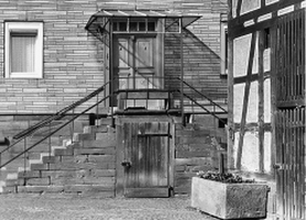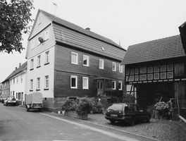 Gegenüber giebelständige Scheune als Ständerbau errichtet. Inschrift über dem Torbalken: "DEN DREISSIGSTEN DAG MAY ISD DIESER BAVW ERBAUVD WORDEN MID DER HILFE GOTTES DURCH DEN HENRICH IAKOBI WITWE ELISABETHA IHM IAHR ANO 1684". Fachwerk mit kräftigen gebogenen Streben. Unter dem rechten Teil befindet sich ein ehemals gewölbter Keller. Zwischen Wohnhaus und Scheune das Bäuchen aus dem späten 19. Jh., ein in Roßdorf häufiger vorkommendes Mehrzweckgebäude mit Nutzung als Stall, Gesindekammer, Fruchtboden und Brennholzlager; typisch der luftige Abschluß des Lagers durch Latten.