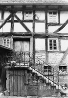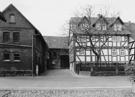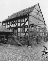 Hofanlage am westlichen Rand des alten, ehemals vom Dorfgraben umgebenen Ortskernes, bis etwa 1910 in Form eines von der Straße erschlossenen Streckhofes mit giebelseitig anschließender Scheune, später Stall seitlich und Scheune im Hinterhof. Wohnhaus in Rähmbauweise als prägender Bestandteil einer Reihe von traufständigen Bauten, errichtet über einem als Stall genutzten Keller, dessen linker Bereich heute bis ins Erdgeschoß massiv erneuert. Aufgrund der mehr als 40jährigen Unbewohntheit befindet sich vieles noch im Zustand von etwa 1910: die einläufigeSandsteintreppe mit Kellerzugang unter dem Podest, die Haustür sowie die Bleisprossenfenster; im Inneren selten erhaltene, farbige Wandbemalung - z.T. bis in die Jugendstilzeit zurückreichend - in Schablonentechnik mit reich verzierten Bordüren; in einer Kammer Lehmstuckdecke. Das bis in den Keller hinunterreichende Fachwerk aus kräftigen, teilweise gebogenen Hölzern weist für die Zeit um 1700 typische breitgestellte Verstrebungsformen auf. Im Keller ein hauseigener Brunnen mit gußeiserner Pumpe. Die Scheune ist in für den Beginn des 20. Jhs. ungewöhnlichem Fachwerk aus Eichenholz ausgeführt.