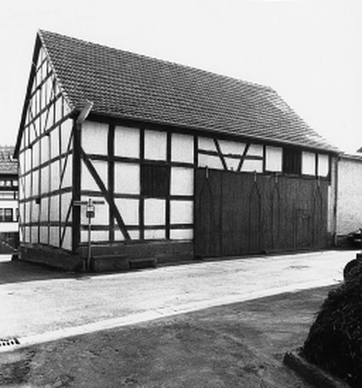 In Ständerbauweise, mit partiell erhaltenen, überblatteten Langstreben errichtete Scheune als bedeutsamer Teil des im Ortsgrundriß noch erkennbaren, ehemaligen Scheunenkranzes, der den wehrhaften Dorfabschluß zusammen mit dem davorliegenden Wallgraben bildete; laut Inschrift auf dem Torbalken 1660 erbaut. Störung durch unproportioniertes Schiebetor.