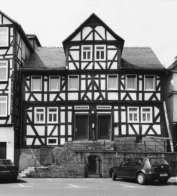Zweigeschossiges, traufständiges Doppelhaus an der Treppe des erhöht angelegten Zugangs Auf dem Groth, das gut erhaltene Rähmfachwerk mit Profilierung am Geschoßwechsel bis in den Keller reichend, lebhaftes Gefüge des frühen 18. Jhs. Mit voll ausgebildeten Mannfiguren an Eckpfosten und in Gebäudemitte. Hier auch die Hauseingänge mit profilierten Türahmen, darüber im Dach großes Zwerchhaus. Unter dem Gebäude Felsenkeller mit vorgelagertem Eingang auf Straßenniveau.