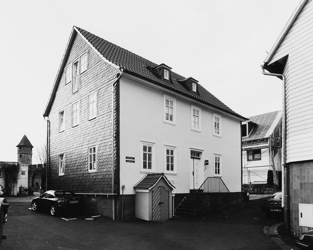 Der zweigeschossige, auf Sandsteinsockel errichtete Fachwerkhau in konstruktiver Rähmbauweise des 19. Jhs. diente ehemals als Pfarrhaus; er ist heute verputzt und mit Schiefer und Asbestzementplatten verkleidet. Originale zweiflügelige Hauseingangstür mit Oberlicht über repräsentativer Außentreppe, Kellereingang mit Überdachung. Von städtebaulicher Bedeutung als freistehendes Gebäude in der Sichtachse der Hofackerstraße.