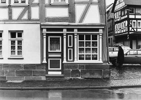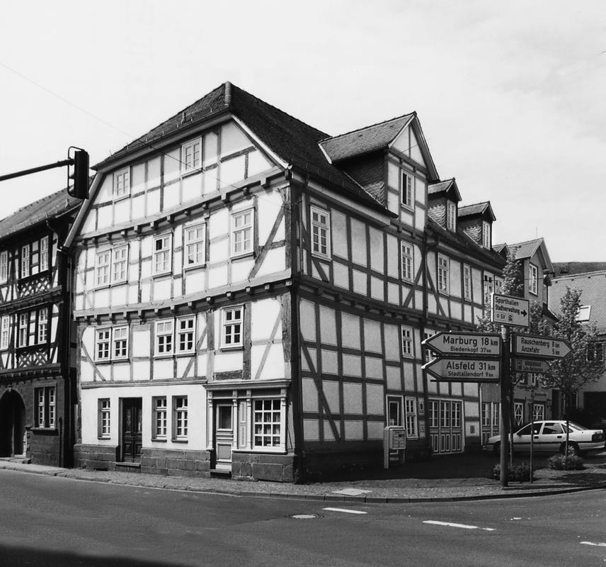Ehemaliges Ackerbürgerhaus in Ecklage, gegenüber der geschlossenen Bebauung der Brießelstraße zurückgesetzt und so die Einmündung in die Borngasse markierend. Für Kirchhain typische Mischbauweise des späten 17. Jhs. mit zweigeschossigem Ständerunterbau und aufgesetztem Rähmobergeschoß. Umlaufender, profilierter Überstand, weitausladende Mannfiguren an Bund- und Eckpfosten, das Dach mit Krüppelwalm. Die ursprünglich auch landwirtschaftliche Nutzung läßt sich noch an der Toreinfahrt und dem Speicherausbau des rückwärtigen Gebäudeteils ablesen.