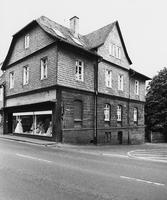 Giebelständiges, zweigeschossiges Wohn- und Geschäftshaus in Ecklage zur Mühlgasse. Das Gebäude der Zeit um 1910 im Erdgeschoss in Sandsteinquadern mit segmentbogigen Fenstern, eingetieften Brüstungsnischen und umlaufendem Deckengesims. Das Obergeschoß unter dem Schieferbehang in zeittypischem Schmuckfachwerk. Das Dach giebelseitig mit Krüppelwalm, an der Traufseite Risalit mit Zwerchhaus. Im Erdgeschoss Störung durch Ladeneinbau. Das repräsentative, großvolumige Gebäude, ehemals Apotheke, in materialbetonter Ausführung des Heimatschutzstils. Dazugehörig im Hintergrund ein zeitgleich erichtetes, massives Stallgebäude. Der kleine Hofraum wird beherscht von einer großen Kastanie.