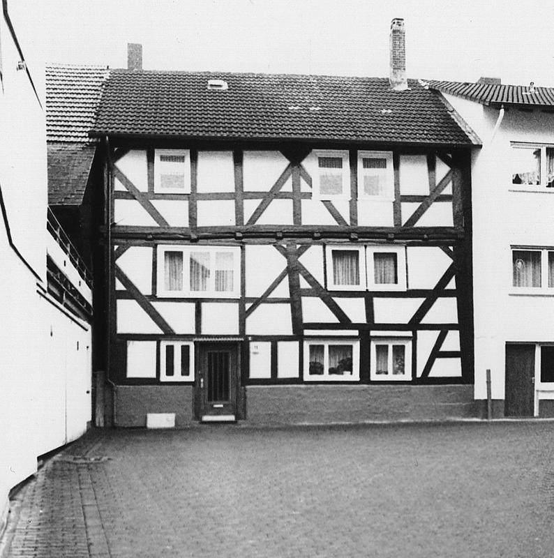 Traufständiges, dreigeschoßiges Wohnhaus, von der Straße weit zurückliegend, mit der für Kirchhain typischen Fachwerkstruktur zweier in Ständerbauweise erichteten Geschosse und einem daraufgesetzten, überkragenden dritten Stockwerk. Eckständer direkt auf dem Sockel stehend; das Fachwerk des zweizonigen Gebäudes mit breitgestellten Mannfiguren geschmückt. Störungen durch unproportionierte Fenstereinbauten. Entstehung um 1730.