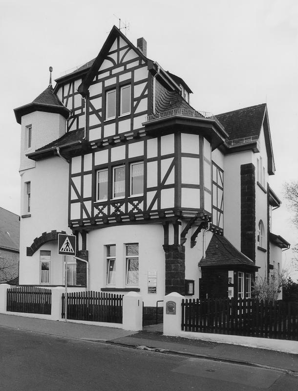 Historistische Villa mit massivem Erdgeschoß und Ober- und Dachgeschoß in Schmuckfachwerk aus dem frühen 20. Jh. Differenzierte Grundrißgestaltung durch zahlreiche Zwerchhäuser und Erker sowie einen sechseckigen Turm, die Dachlandschaft in ähnlicher Weise belebt. Durch die Eckstellung zur Hindenburgstraße und die Lage in der Sichtachse der Eisenbahnbrücke von besonderer städtebaulicher Bedeutung im Bereich der Bebauung unmittelbar über dem Bahneinschnitt.