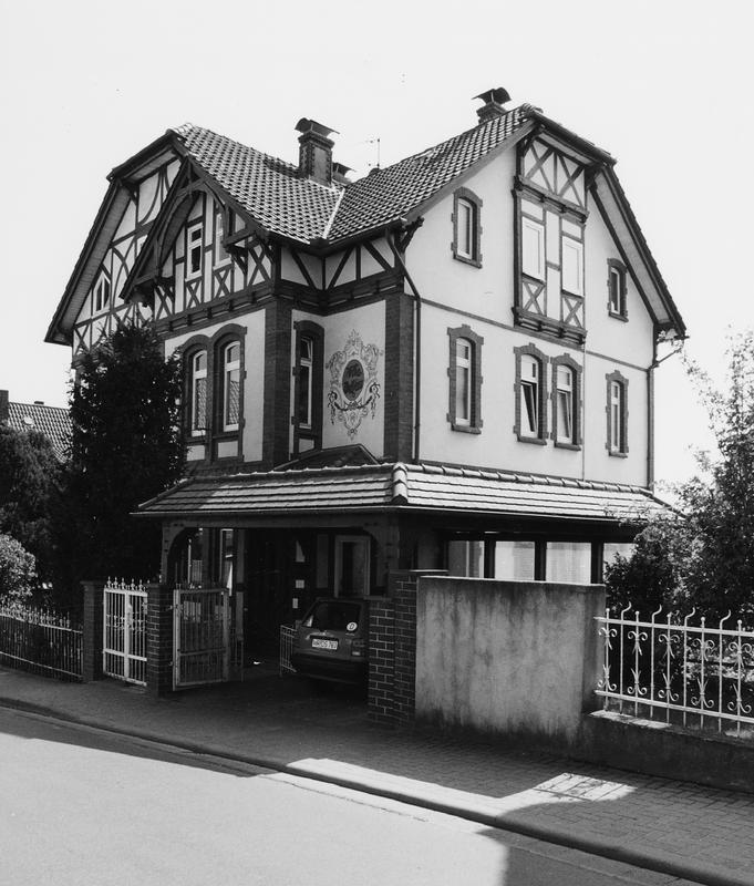 Durch den über zwei Geschossen aufgesetzten Kniestock hoch aufragende Villa. Die zwei Untergeschosse sind von der Materialqualität der Putzfassade mit ihrer Ziegelsteingliederung und dem zwerchhausartigen Erker geprägt; das Dachgeschoß mit dem Krüppelwalmabschluß ergänzt durch die pittoreske Fachwerkverwendung den Gesamteindruck eines durch den englischen Landhausstil beeinflußten Villengebäudes des ausgehenden 19. Jhs. Die großenteils erhaltene Einfriedung unterstreicht die künstlerische Bedeutung.