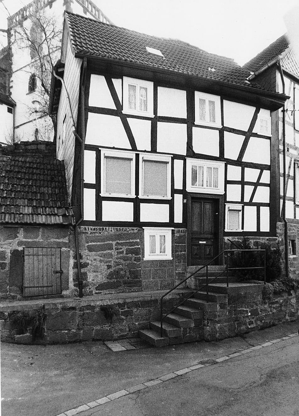 Kleines traufständiges Tagelöhnerhaus, das mit dem rückwärtigen Teil auf der Kirchhofmauer aufsitzt. Ursprünglicher Ständerbau mit Alsfelder Strebe im Obergeschoß, das Erdgeschoß im 19. Jh. in konstruktivem Fachwerk erneuert. Hoher Sockel mit Stallnutzung, einläufige Außentreppe. Entstehung als Wohnwirtschaftsgebäude der unteren sozialen Schicht im 18. Jh.