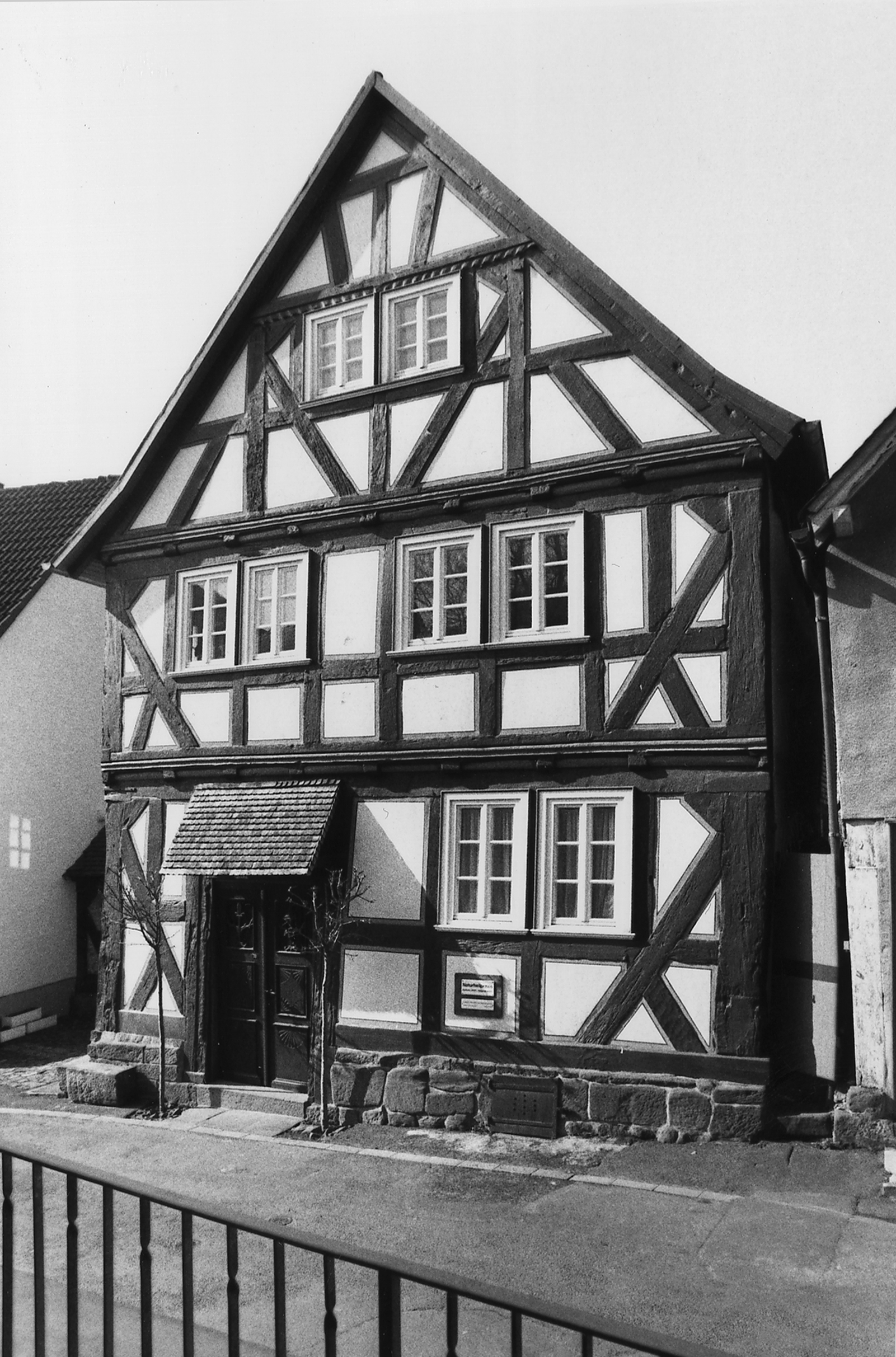 Giebelständiges zweigeschossiges Wohnhaus als Fachwerkrähmbau mit kräftigem, lebhaften Gefüge aus Mannfiguren mit Kopfholz und Fußgegenstrebe. Eingang ebenerdig, Stubenbereich unterkellert. Der Geschoßversatz ist mit reicher Profilierung ausgeführt; im Giebeldreieck schön sichtbar die Stuhlverstrebung und das eingeschnitzte Tau. Teile der ursprünglichen Türpfosten erhalten. Erbaut in der ersten Hälfte des 18. Jhs. als Teil der engstehenden giebelständigen Bebauung im Bereich um die Kirche.
