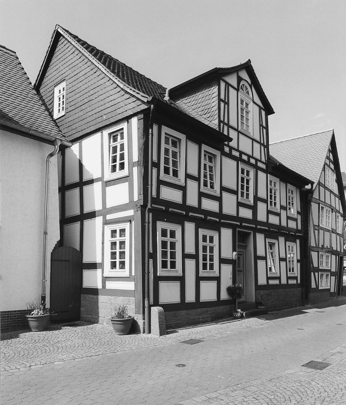 Traufständiges zweigeschossiges Wohnhaus als Stockwerksbau, in der Straßenflucht vorstehend, der Eingang giebelseitig durch ein Zwerchhaus mit kreisrundem Fenster betont. Gut erhaltenes Exemplar der kleinteiligen Bebauung in typischer Bauweise des 19. Jhs.