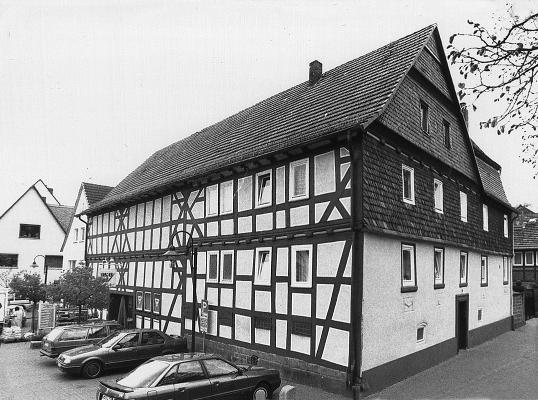 Ehemaliges bäuerliches Anwesen mit großvolumigem Hauptgebäude in Rähmbauweise, das Fachwerk in den Keller reichend. Im Obergeschoss vorkragend rundum mit leicht profiliertem Rähm, das Dach teilweise als Mansarddach ausgebildet. An den Gebäudeecken Verstrebungsfiguren in Form von dekorativen "halben Männern". Die Giebelseite als Putzbau mit bescheidenem Ornament gestaltet, im oberen Teil verschiefert. Die rückwärtige Scheune in zeitgleichem Fachwerk heute als Supermarkt umgenutzt. Durch die Übereckstellung des Hofes am Platz der abknickenden Schulstraße von großer städtebaulicher Wirkung.