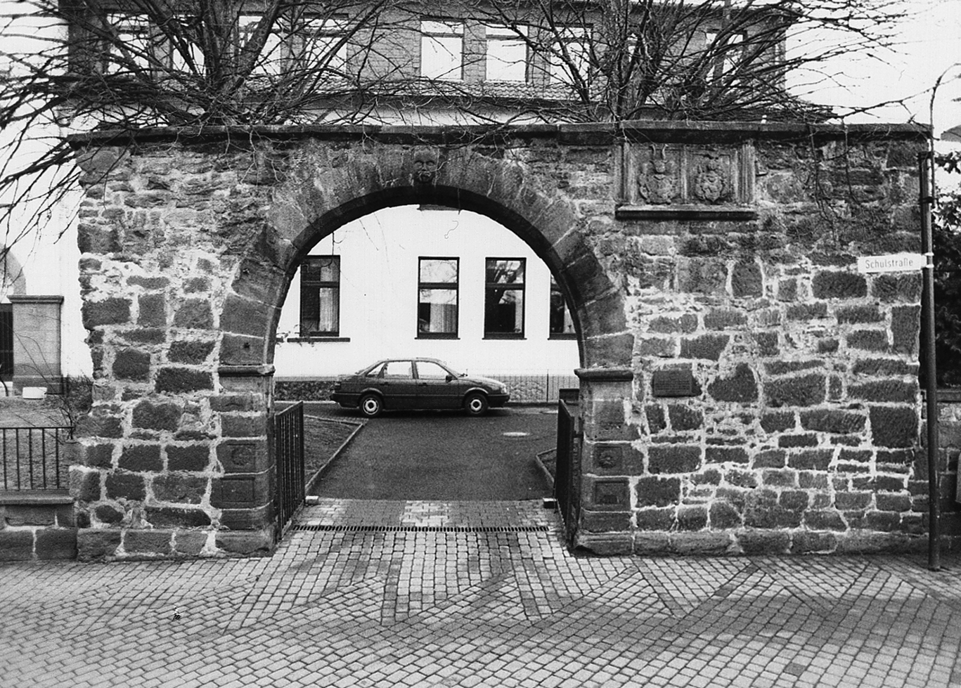 Das Renaissanceportal vor dem Haus Schulstraße 10 gehörte zur Hofummauerung eines inzwischen abgebrochenen ehemaligen Burgmannenhofes. Rundbogiges Tor mit Quaderfassung, Kopfkonsolen, plastischen Rosetten und Wappen (Darstellung von Hühnervögeln). Der Scheitelstein trägt die Darstellung eines Gesichtes. Entstehungszeit im 16. Jh.