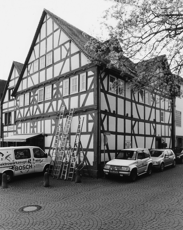 Giebelständiger Fachwerkbau in Rähmfachwerk aus der Mitte des 18. Jhs. Mit vollausgebildeten Mannfiguren und kräftigen profilierten Eckpfosten. Ursprünglich zweischiffig, später traufseitig in gleichbleibendem Gefüge und auch mit Profilierung der neuen Hölzer erweitert. Das anschließende Wirtschaftsgebäude heute in Geschäftshaus integriert. Als Eckbau ist es Teil der Platzrandbebauung und von großer städtebaulicher Wirkung auf den davorliegenden Freiraum.