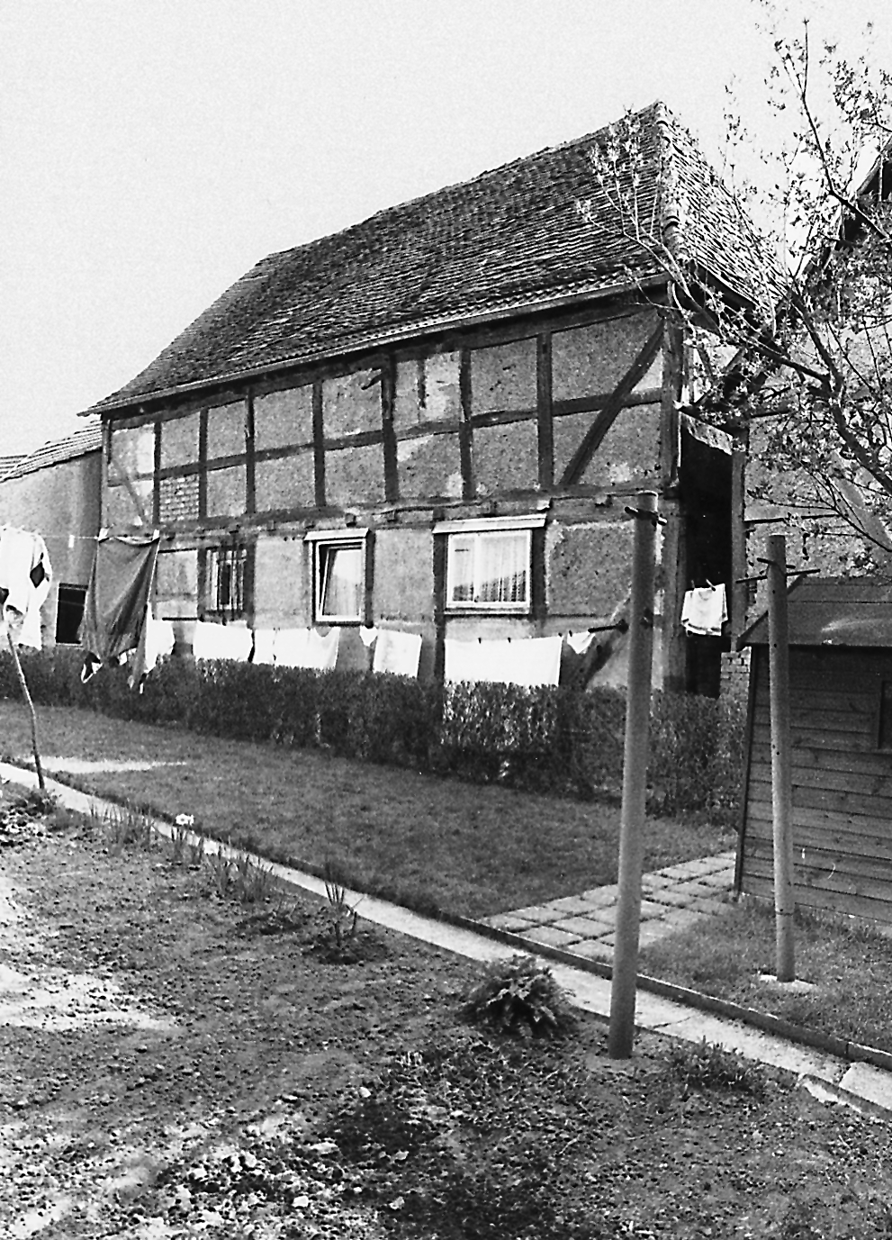 Giebelständiges zweigeschossiges Ackerbürgerhaus, breitgelagert mit symmetrischer Fassadengestaltung und Krüppelwalmmansarddach. Fachwerk verputzt, vermutlich Ständerbauweise aus der Zeit des ausgehenden 17. Jhs.; Sandsteinstufen des Eingangs erhalten. Zu einem Doppelhaus umgebaut mit zwei nebeneinanderliegenden Eingängen. Das rückwärtige Wirtschafts- und Lagergebäude in früher Rähmverzimmerung ohne Füllhölzer aus dem Beginn des 18. Jhs. Unter dem Walmdach ein kräftiges Fachwerk mit leicht gebogenen Dreiviertelstreben; der Bau ist heute zu Wohnzwecken genutzt.