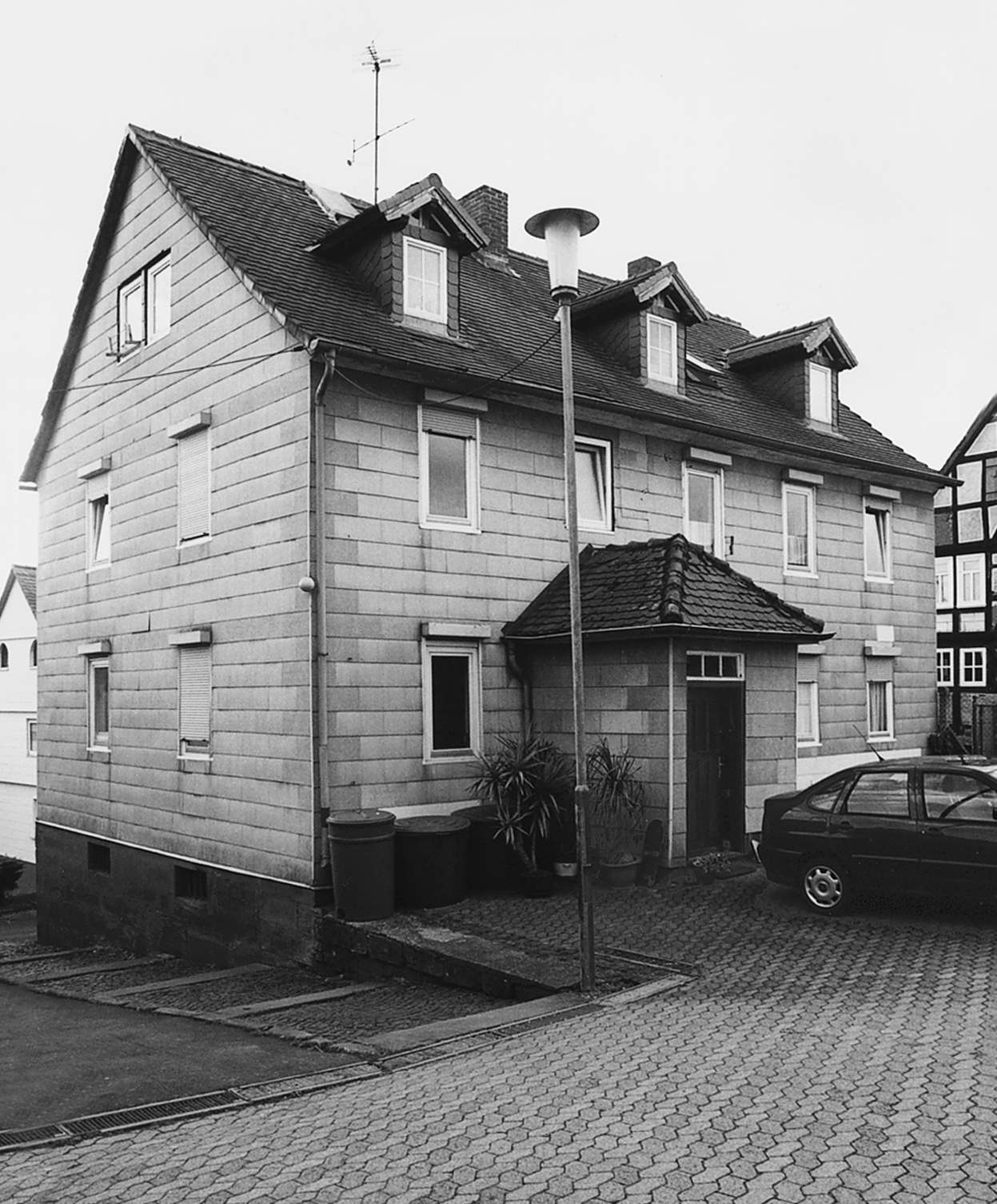 Mit der Traufseite zum Platz an der Kirche stehendes Wohnhaus aus dem Ende des 19. Jhs. Rähmbau ohne sichtbaren Geschoßversprung auf mit dem Gelände ansteigendem Sockel, darin talseitig der ehemalige Stallzugang. Die fünfachsige Fassade ist vollständig mit Platten verkleidet.