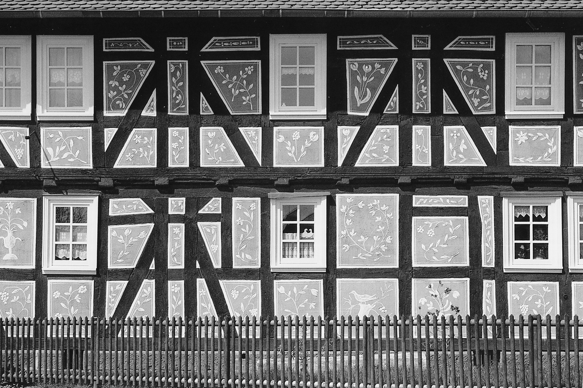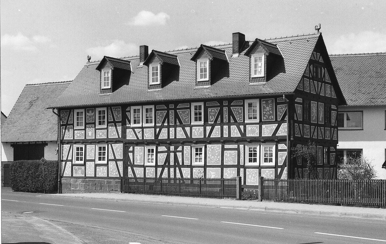 Entlang der Lahnstraße sich erstreckendes Einhaus, das durch die zurückliegende Nachbarbebauung sehr exponiert im Straßenraum steht. Der rechte Teil steht als Rähmbau auf niedrigem Sockel mit überkragendem Obergeschoß und ungewöhnlich geteilten Mannfiguren aus dem Jahr 1769. Der linke Teil mit hinterem Schleppdachanbau stammt aus dem frühen 19. Jh. Die Gefache beider Teile sind komplett mit künstlerisch wertvollen Kratzputzmotiven nach alten Vorlagen ausgestattet.