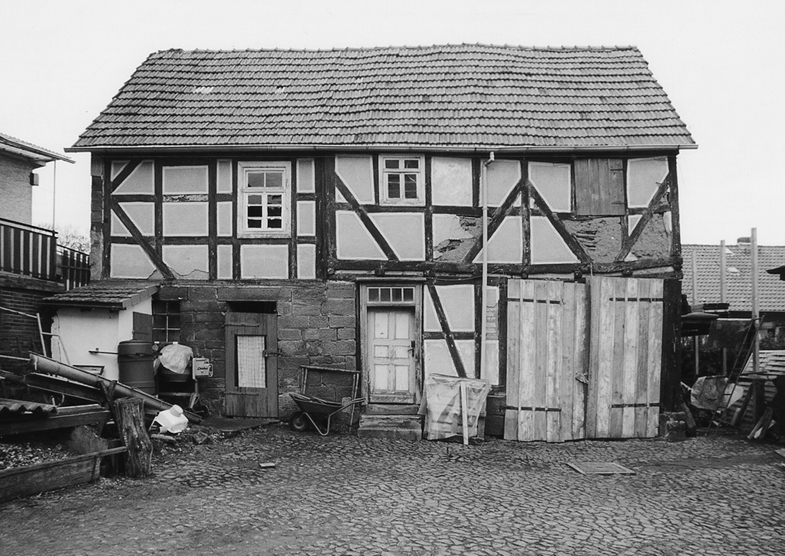 Zweiseithof am nördlichen Ende des alten Dorfkernes mit giebelständigem Wohnhaus, das mit dem gegenüberstehenden Haus Nr. 6 eine als Tor wirkende Engstelle bildet. Der zweizonige Rähmbau mit bis in den Keller reichendem Fachwerk, hier ehemals Stallnutzung. Das Obergeschoß überkragend mit profilierter Schwelle, die Mannfiguren an Eck- und Bundstielen mit Fußgegenstrebe. Der Scheunenteil des Wirtschaftsgebäudes mit einfachen Dreiviertelstreben noch aus dem 18. Jh., die Haustür stammt vermutlich aus dem Wohnhaus. Der Stallteil im 19. Jh. mit Bruchsteinmauerwerk im Untergeschoß errichtet. Das Basaltpflaster sowie die Einfriedung des Hofes erhalten.