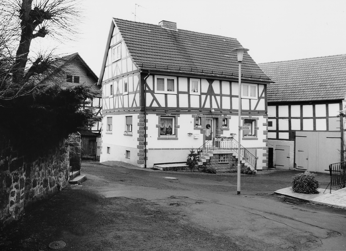Dreiseitig von Straßen umgebener, kleinbäuerlicher Hof gegenüber dem westlichen Kirchenportal. Das Wohnhaus in Fachwerkformen um 1800 wurde zu Beginn des 20. Jhs. in zeitgemäßem Stil massiv unterfangen und mit neuer zweiläufiger Treppe versehen. Die auf quadratischem Grundriß errichtete Scheune mit durchlaufenden Eckständern vermutlich noch aus dem 18. Jh.