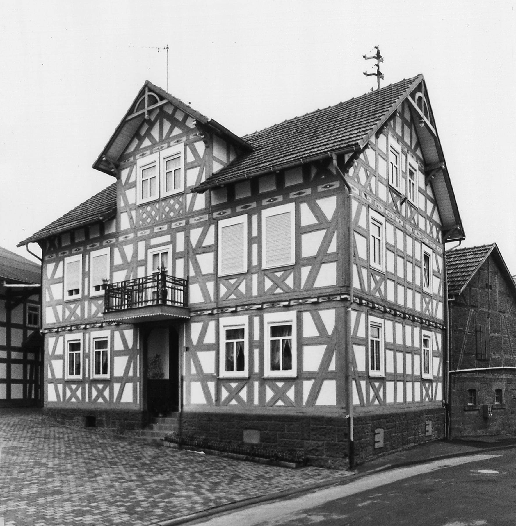 Kleine Hofanlage des späten 19. Jhs., die ungefährdet vom Hochwasser der Ohm auf dem Homberg angesiedelt ist. Traufständiges Wohnhaus mit großem Zwerchgiebel in typischem konstruktiven Fachwerk der Entstehungszeit. Zwischen Wohnhaus und dem Wirtschaftsgebäude im Hintergrund befindet sich die kleine Hoffläche. Guterhaltenes Beispiel der kleinbäuerlichen Ansiedlung auf der beengten Anhöhe südöstlich der Kirche.