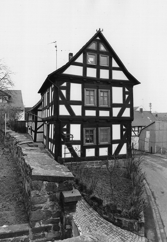 Dicht an der Kirchhofmauer exponiert stehendes, kleines Wohnhaus mit kräftigem, im Obergeschoß vorkragendem Fachwerk. Die Eckpfosten direkt auf dem talseits hoch aufragenden Sockel, breitgestellte Mannfiguren. Der Überlieferung nach als Gerichtsgebäude in der zweiten Hälfte des 17. Jhs. erbaut.