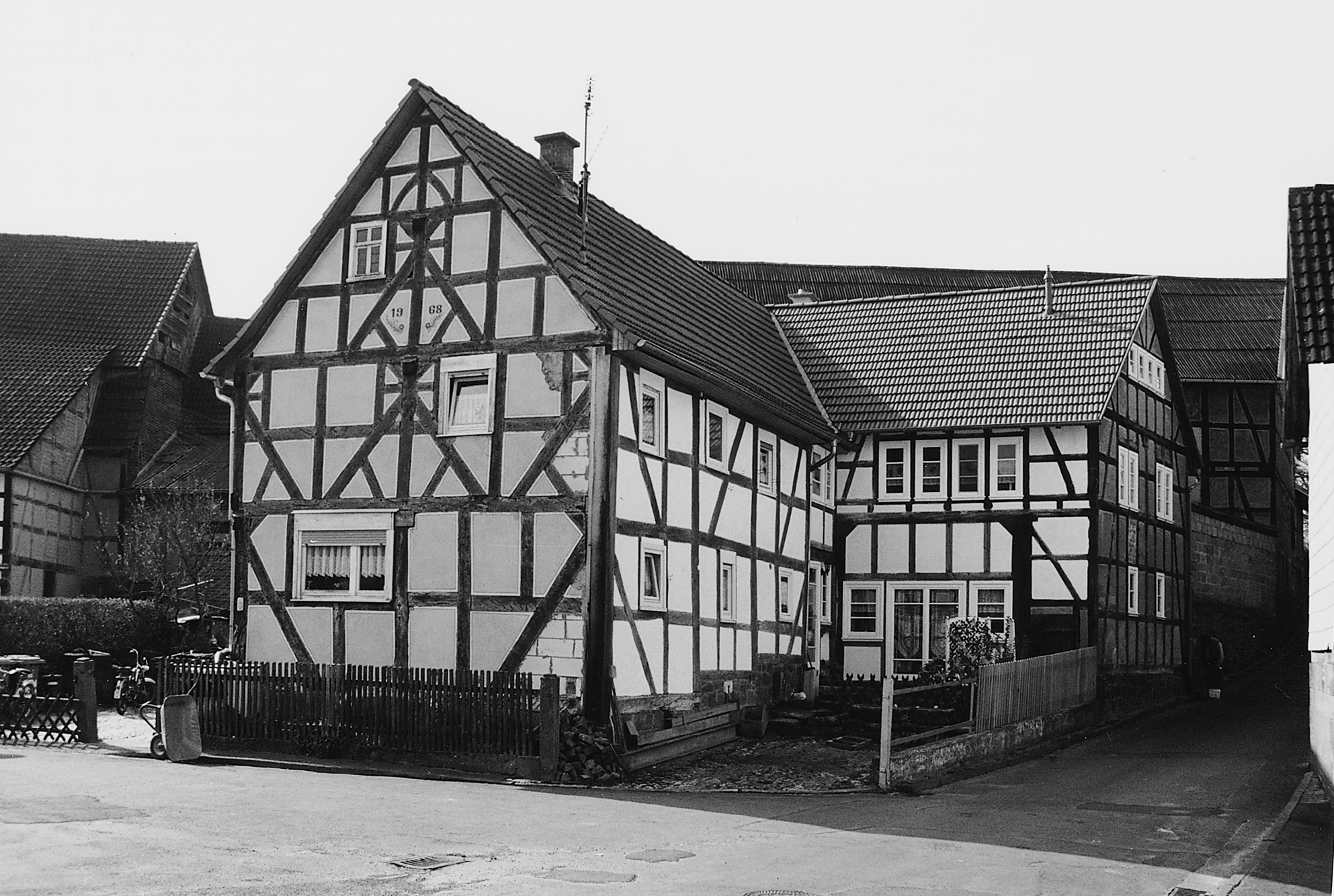 Kleines, in exponierter Ecklage stehendes Wohnhaus eines Hakenhofes, dessen Fachwerk auf niedrigem Sockel stehend z.T. noch in Ständerbauweise errichtetet ist. Erhalten haben sich einige Fenster mit Bleisprossenteilung. Dekorative Gestaltung der Platzfassade durch Mannfiguren und geschweifte Hölzer im Giebeldreieck. Erbauungsdatum Ende des 17. Jhs.