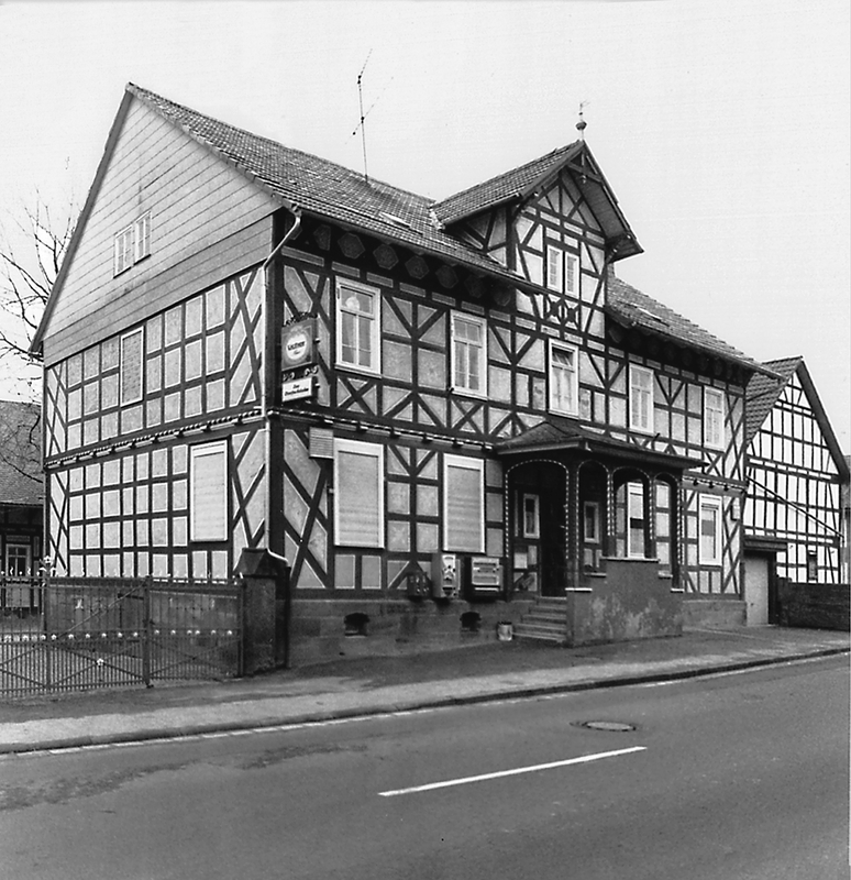 Das traufständige Haupthaus wurde 1908 als Gasthaus im Stil der Fachwerktradition errichtet. Die Geschosse sind leicht übersetzt, die reichhaltige Fachwerkausstattung in eine ungewöhnlicher, symmetrischer Anordnung. Großer Zwerchgiebel in der Mittelachse, knaufbesetzt mit Wetterfahne. Der Eingangsvorbau mit geschnitzten Balken und Sinnspruch im Heimatstil der Dreißiger Jahre des 20. Jhs. Hoftor in schöner ortstypischer Ausführung.