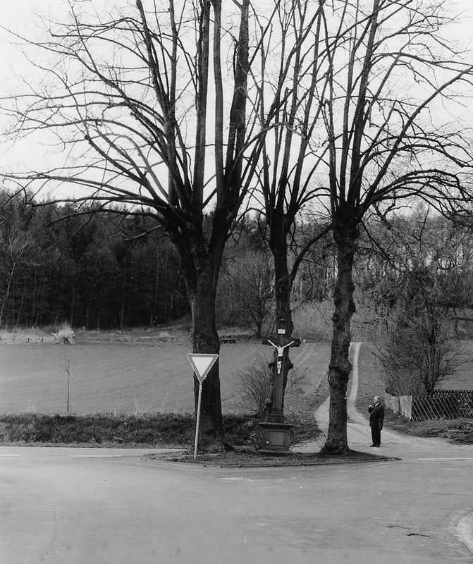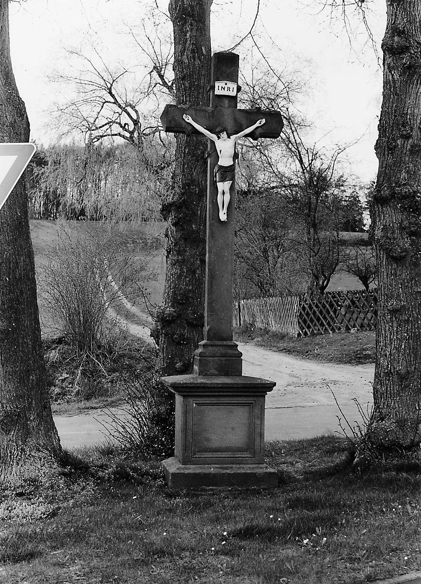 Von drei Linden umstandenes Kruzifix an einer Straßeneinmündung gegenüber dem Friedhof. Das 1890 gestiftete Sandsteinkreuz auf Sockel und Postament ist mit einem Gußkorpus versehen und markiert als ortsgeschichtliches Zeugnis der bäuerlichen Frömmigkeit den westlichen Ortseingang. Inschrift im Sockel: "Wir wollen uns rühmen im Kreuze unseres Herren, denn in Ihm ist unser Leben, unser Heil und unsere Auferstehung".