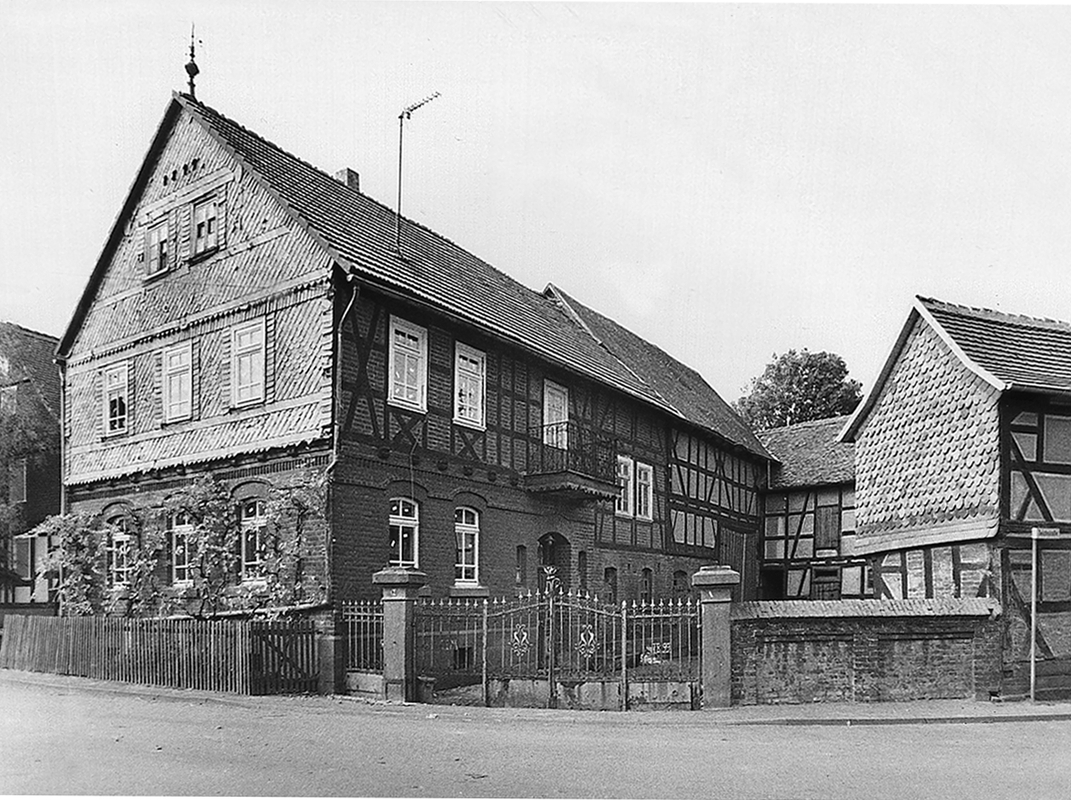 Zentral im alten Dorfkern gelegener, kleinerer Dreiseithof mit Öffnung zum Dorfplatz und Torbau zur Teichstraße. Hauptgebäude von 1895 giebelständig als Typ des Wohnstallhauses in Ziegelmauerwerk mit rundbogigen Fenstern und Ziergesims zum Fachwerkobergeschoß errichtet. Balkon mit Eisengitter über dem Eingang aus der Bauzeit; Straßengiebel in schönem Schieferbehang mit Datierung. Im Anschluß Stallscheune mit massiv erneuertem Stallbereich; Inschrift über Scheunentor: HAT ERBAUT DIESEN BAU JOHANNES DANK UND SEINE EHLICHE HAUSFRAU MARTHA (SISNBESHN ?) DER ZIMMERMEISTER IST GEWESEN JOHANN HEINRICH TAMM VON SCHWEINSBERG DEN 30ten JUNI 1808. Rechtwinklig anschließendes Stallgebäude mit Gesindewohnung im OG. Schmiedeeisernes Hoftor von 1899 sowie Hofpflaster mit Miste sind noch original erhalten.