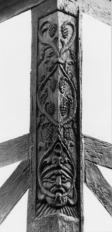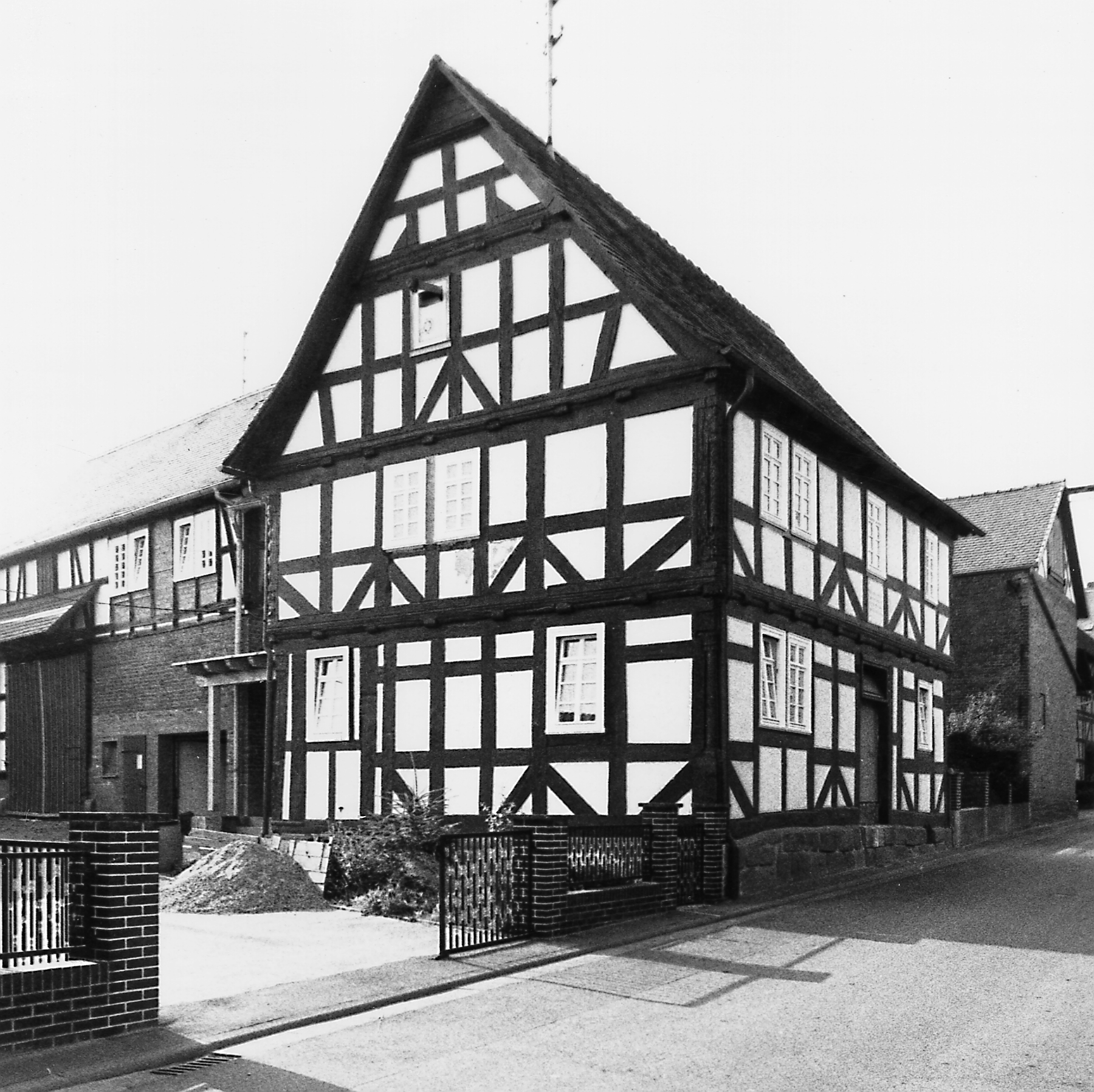 Zweigeschossiges Wohnhaus in ungewöhnlicher traufständiger Stellung unmittelbar an der Straße. Ursprünglich ein giebelseitig erschlossener Rähmbau mit umlaufendem, kräftigem Geschoßversatz . In Langenstein einmalig die Fachwerkaussteifung nur durch brüstungshohe Streben. An den Eckstielen des Erdgeschosses von besonderer künstlerischer Qualität die eingeschnitzten Säulen mit Blattwerkkapitell, im Obergeschoß der sogenannte "Leckmann" mit aufwendigen floralen Motiven. Der durch seine außergewöhnliche Orientierung im Straßenbild wichtige Bau zu Beginn des 18. Jhs. entstanden. Das dazugehörige Wirtschaftsgebäude aus dem 19. Jh.