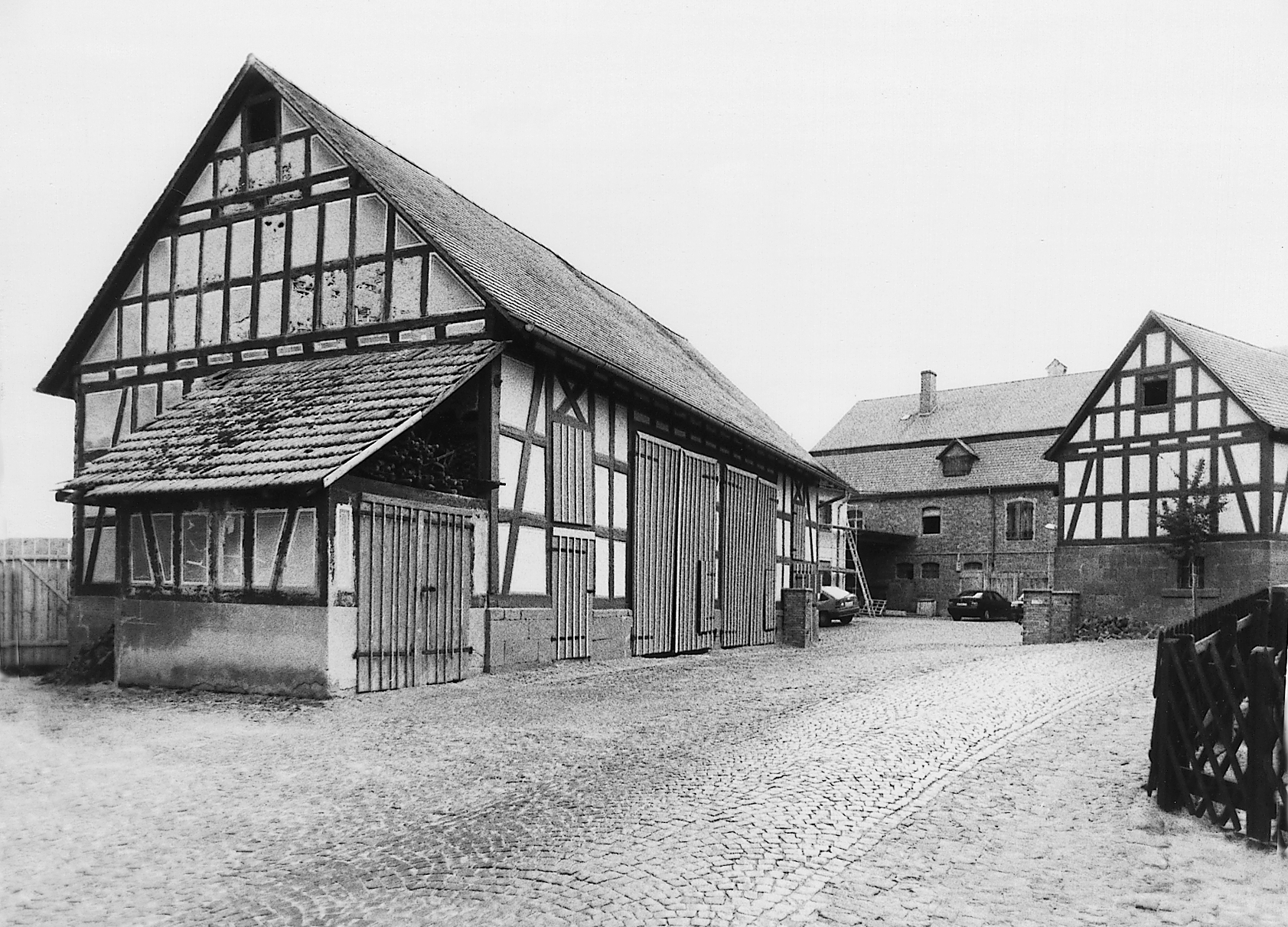 Großer Vierseithof unterhalb der Kirche mit großvolumigen Wirtschaftsgebäuden, die den Straßenraum der Hintergasse über ein langes Stück begrenzen. Hochwertige Ausführung mit Werksteinuntergeschossen und aufgesetztem Fachwerk der Zeit um 1900, z.T. mit Mansarddach und rundbogig gemauerten Toren. Das Wohnhaus aus neuerer Zeit.