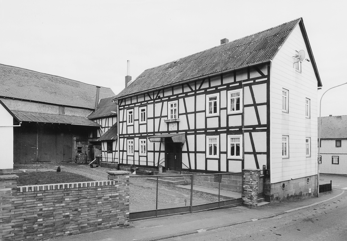 Ein auf dem straßenseitigen Werksteinsockel eingefügter Haustein datiert dieses Wohnhaus eines Zweiseithofes auf 1845. Es ist als Rähmbau mit symmetrischem Fachwerk ohne Geschoßversprungangelegt, eine für die Bauzeit fortschrittliche Konstruktionsweise. Das mit Kniestock versehene Gebäude typischer Vertreter einer fränkischen Hofreite, die in der Reihung der giebelständigen Wohnhäuser den Straßenraum rhythmisch gliedern. Die querstehnde Scheune ist mit Holzschindeln verkleidet, das Hofpflaster mit eingefügter Miste hat sich gut erhalten.