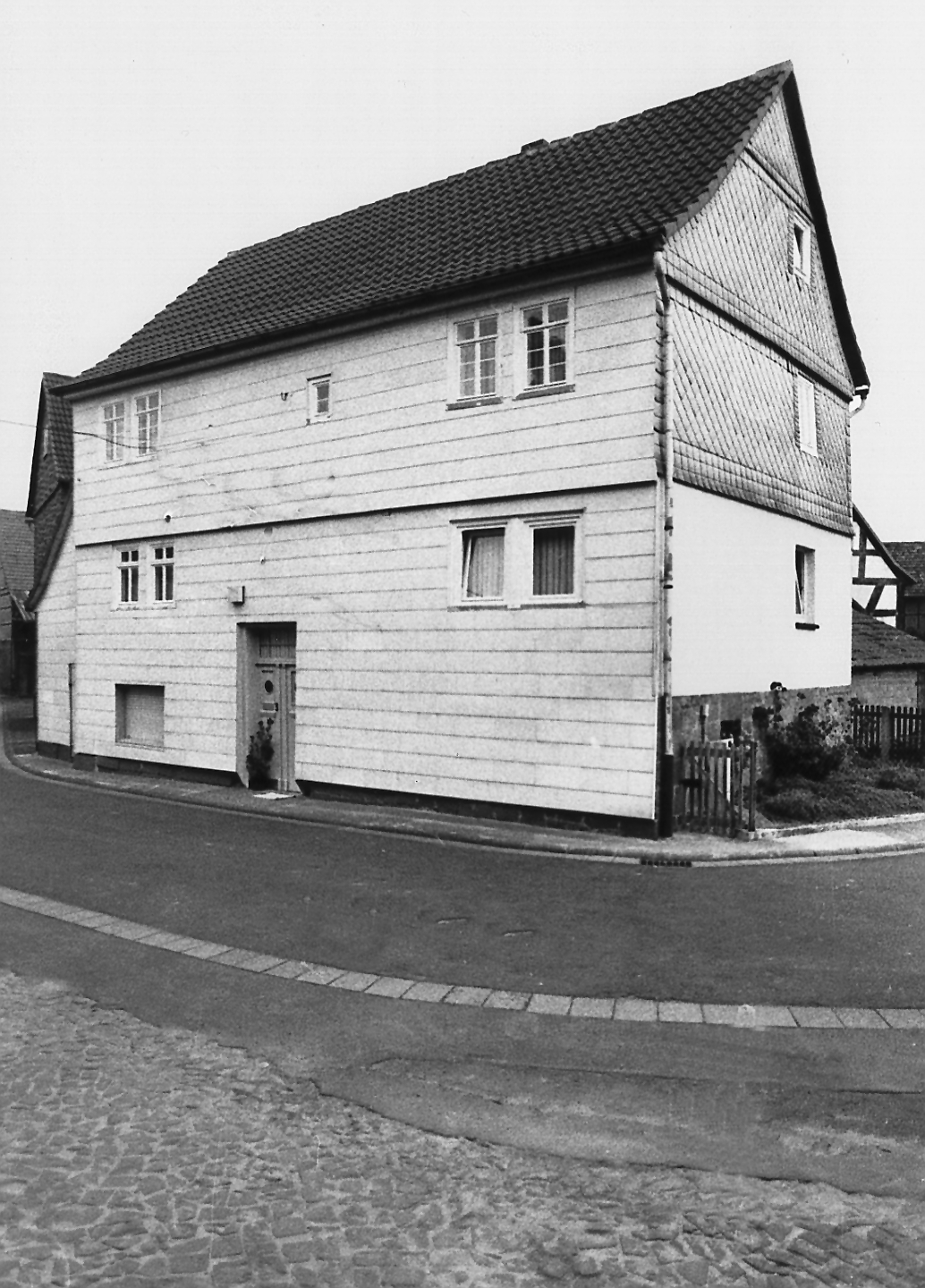 In einer Kurve liegender Parallelhof, die Gebäude durch die Straße getrennt. Das Wohnhaus mit hohem Untergeschoß, hier unter den Stuben ehemals Stallnutzung, der Eingang ebenerdig mit Haustür aus dem 19. Jh. Unter der nahezu vollständigen Verkleidung wird ein Rähmbau mit Geschoßversatz womöglich noch aus dem 17.Jh. ähnlich Obergasse 27 zum Vorschein kommen. Die gegenüberliegende Scheune, ebenfalls ganz mit Platten versehen, inschriftlich datiert 1662. Damit gehört dieser Hof zu den ältesten im Dorf.