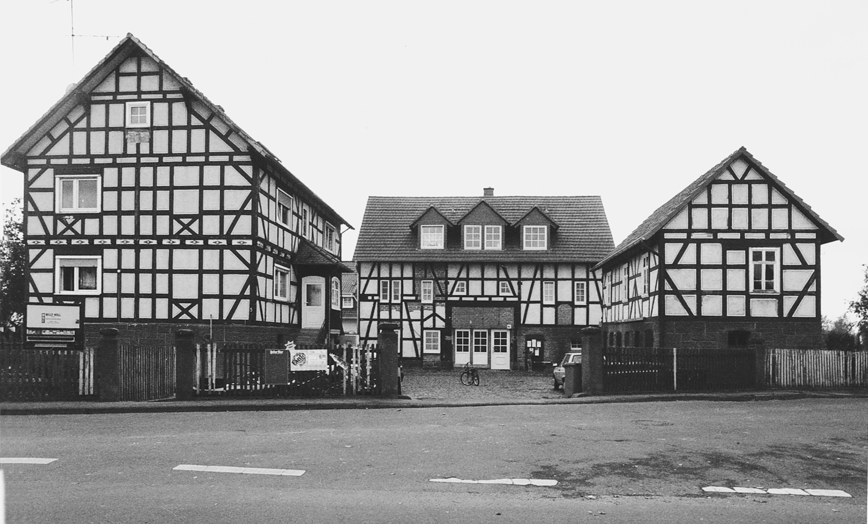 Städtebaulich den weitgehend unbebauten Raum am Ortseingang beherrschender Dreiseithof aus dem frühen 20. Jh. Das dekorativ angeordnete Fachwerk ist im Sinne des Heimatschutzstils in historisierenden, dem dörflichen Barock entlehnten Formen angelegt. Das Wohnhaus auf Werksteinsockel mit zweiläufiger Treppe datiert 1911, gut erhalten die Hofeinfriedung aus profilierten Sandsteinpfosten und Staketenzaun.