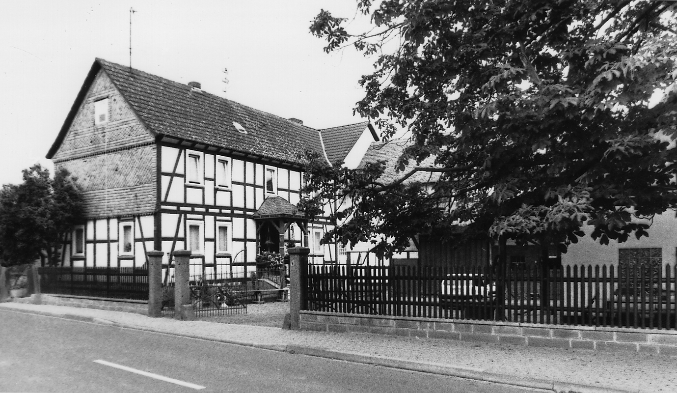 Dreiseithof am nördlichen Ortsausgang mit sandsteinernen Pfosten und Gittertor als Hofeinfassung. Das giebelständige Wohnhaus aus dem Ende des 19. Jhs. ist ein fünfachsiger Rähmbau in für die Zeit typischem Fachwerk mit Eingangsvorbau aus der Bauzeit. Der Straßengiebel handwerklich gut in Schiefer verkleidet. Wirtschaftsgebäude ebenfalls aus dem 19. Jh.