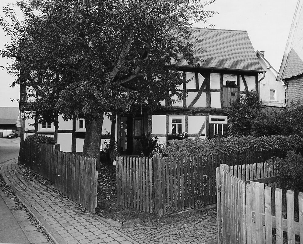 Im Anschluß an die Kirche giebelständiges Wohnhaus mit Erweiterung durch Wirtschaftsteil. Errichtet wohl noch im 17. Jh. als Mischkonstruktion, die Hoftraufe in Rähmbauweise, die übrigen Seiten mit durchgehenden Ständern und geschoßhohen Streben. Am ebenerdigen Eingang die mit Blumenpokalen besetzte Haustür des 19. Jhs. sowie der im Sandsteinpflaster stehende alte Birnbaum erhalten. Der in den Straßenraum hineinragende Giebel mit Schiefer verkleidet. Die Erweiterung aus dem 19. Jh., das Haus selbst eines der ältesten in Schönbach.
