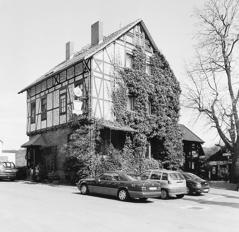 In wichtiger städtebaulicher Eckstellung gegenüber der Kirche angesiedeltes traufständiges Wohnhaus der Zeit zwischen 1890 und 1910; über dem Erdgeschoß in Ziegelmauerwerk befindet sich ein Obergeschoß mit Kniestock aus dünnem Nadelholzfachwerk, das durch die Andreaskreuze gestalterisch hervorgehoben ist. Im Hintergrund ein Werkstattgebäude mit Ziegelausfachung und Wetterbrettverkleidung. Gut erhalten auch die Einzäunung des Gartens mit Sandsteinpfosten entlang des Grünen Weges.